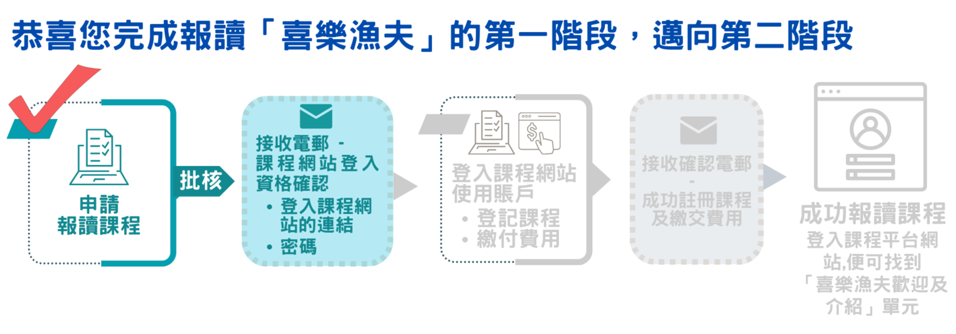 一般情況下,您會在一個工作天內收到標題為「 課程網站登入—-喜樂漁夫培育計劃」的電郵,內附有登入課程網站的連結及密碼。 請注意,你須盡快使用該電郵內資料登入、登記課程及付款後,才算成功報讀此課程,課程名額有限,先到先得。